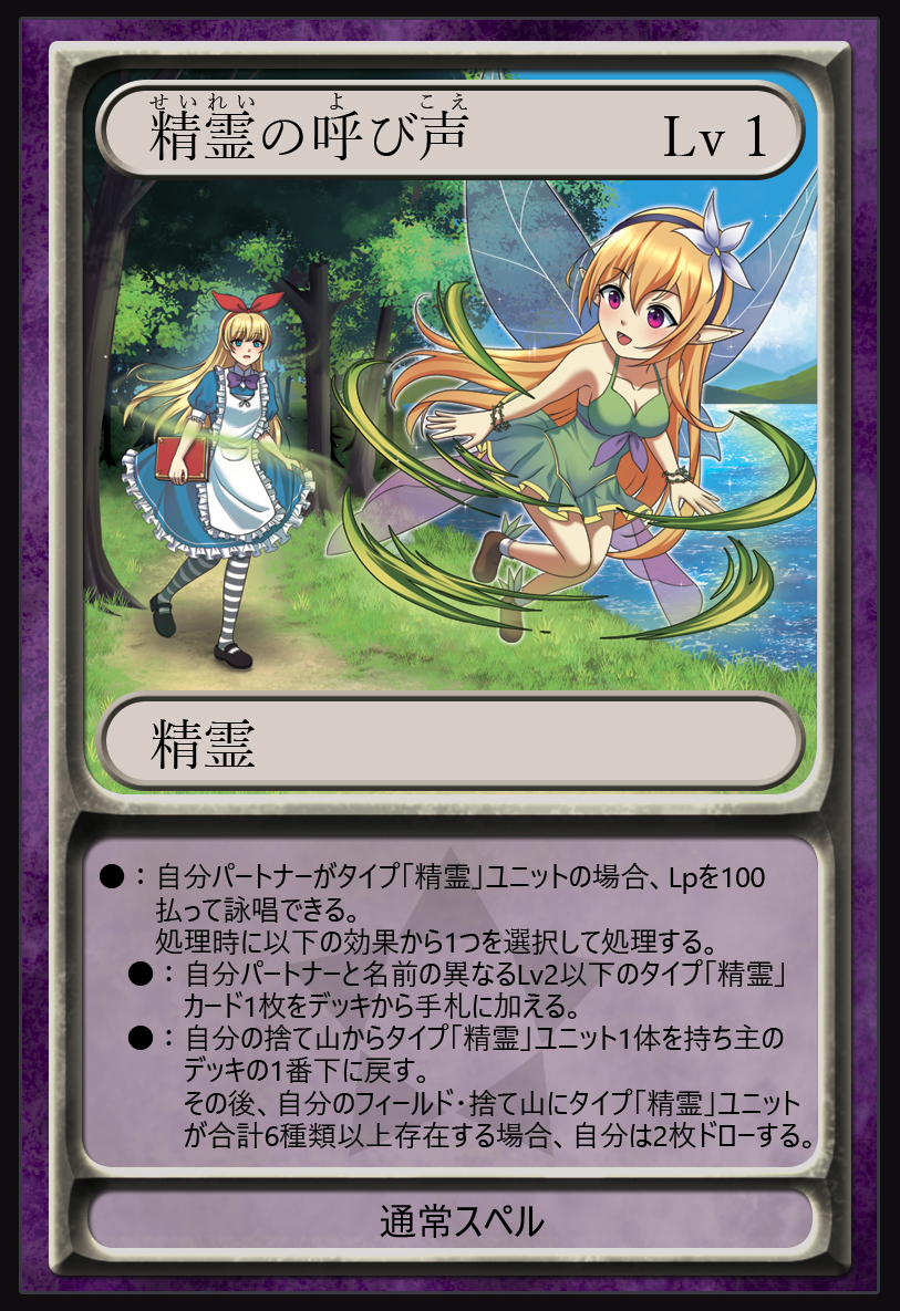 デッキから精霊カードを手札に加えるか、自分の捨て山の精霊ユニットをデッキに戻すか、2つの効果を選べる通常スペル。