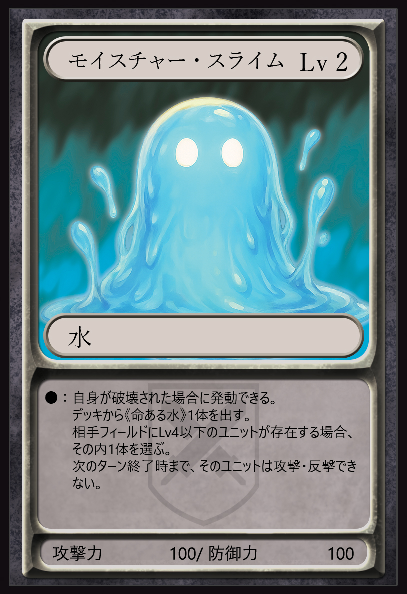破壊された場合に《命ある水》1体をデッキから出しつつ、相手ユニット1体の攻撃と反撃を封じる「誘発能力」を持つ。