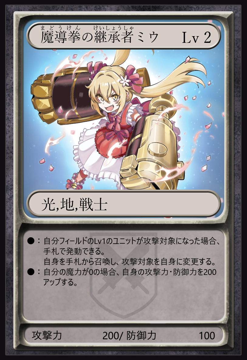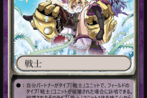 レベル1のユニットが攻撃対象になった時に手札のこのカードを召喚して攻撃対象を自らに変更する「誘発能力」、魔力が0の場合に攻撃力と防御力をアップする「常在能力」を持つ。