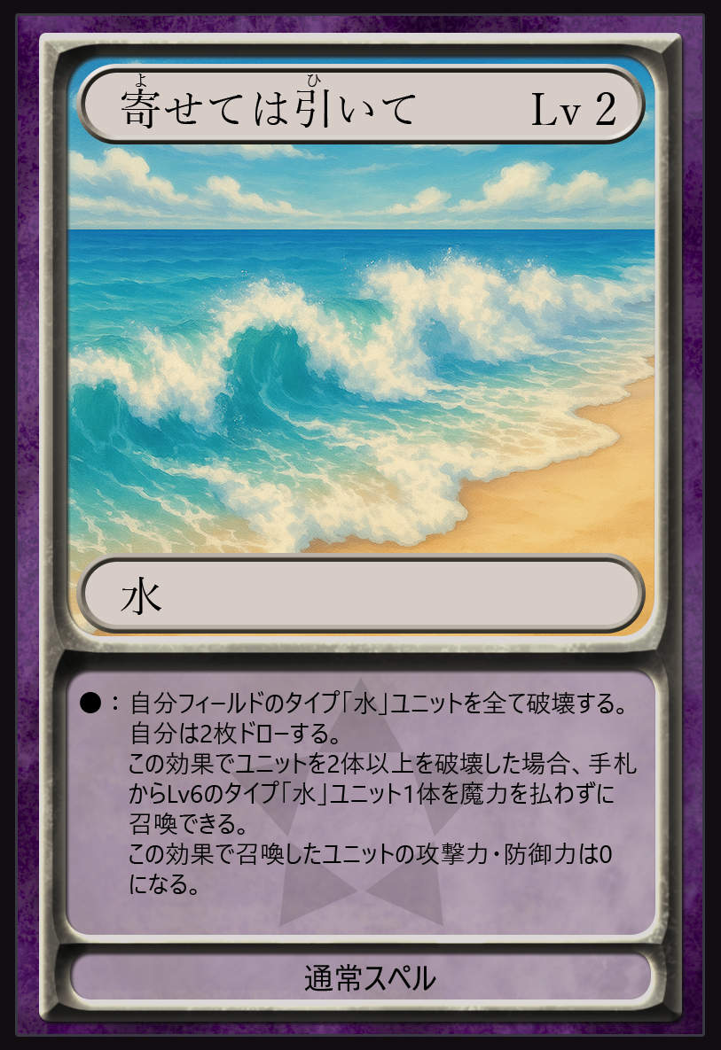 自分フィールドの水ユニットを全て破壊してドローする通常スペル。