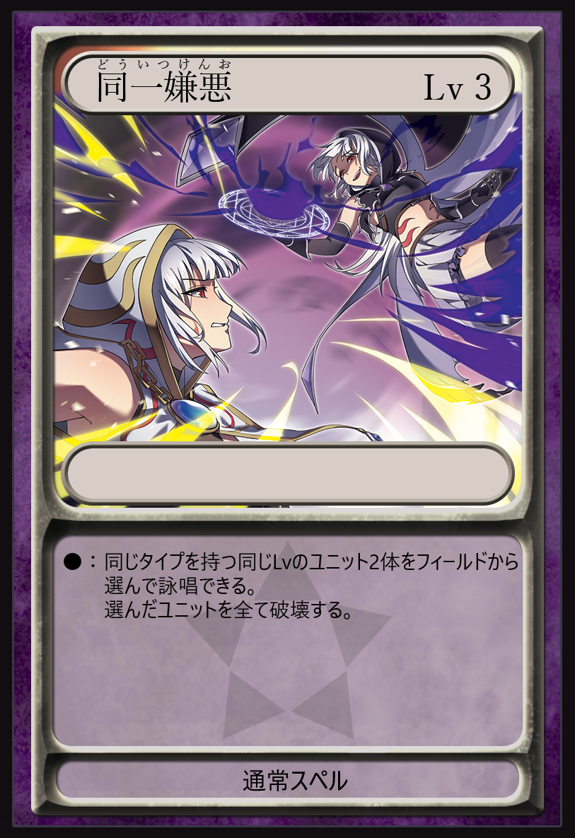 フィールドに存在する同じレベルで同じタイプを持つユニット2体を破壊する通常スペル。