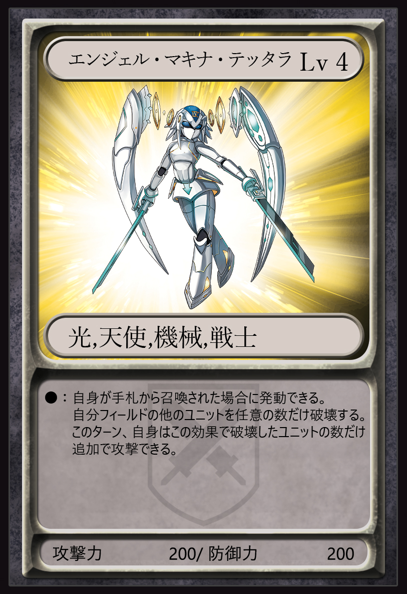 召喚時に破壊した自分ユニットの数だけ攻撃回数を増やす「誘発能力」を持つ。