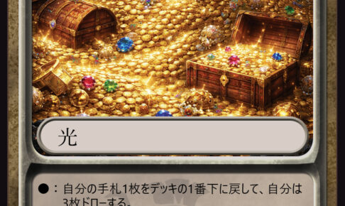 CUS00044 【スペル情報】 ある大盗賊は言った。究極の財宝をどこかの鉱山に埋めて隠した、と。 その言葉をきっかけに、男たちは坑道に潜り夢を追い始めた。 かの有名な大発掘時代の幕開けである。 【カード解説】 詠唱時に…