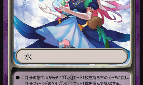 CUS00243 【スペル情報】 それは水を生み出す、奇跡の魔法。 【カード解説】 自分の捨て山の水カードをデッキに戻し、水ユニット1体のレベルと攻撃力をアップする通常スペル。 手札・デッキから捨て札になった時、捨て山の…