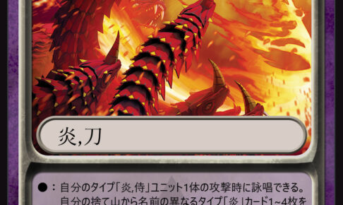 CUS00226 【スペル情報】 それは神殺しの一撃。 【カード解説】 炎侍ユニットの攻撃時に捨て山のカードを隔離することで、デッキのカードを捨て札にしつつ攻撃力を上げる通常スペル。 条件を満たす対象はかなり限られるが、…